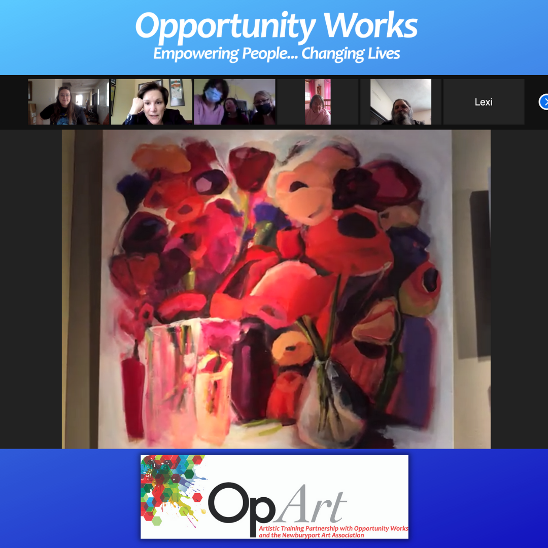 Opportunity Works has a lovely partnership with Newburyport Art Association. The Executive Director, Wanda Strukus, led a wonderful virtual tour of Love is LOVE! at the Newburyport Firehouse Center for the Arts for our participants on ZOOM in March. This virtual tour was a great bridge between the people we support who are in our Newburyport facility, Haverhill facility, and remotely at their homes. Wanda described many of the works on display while engaging the participants in the artwork.