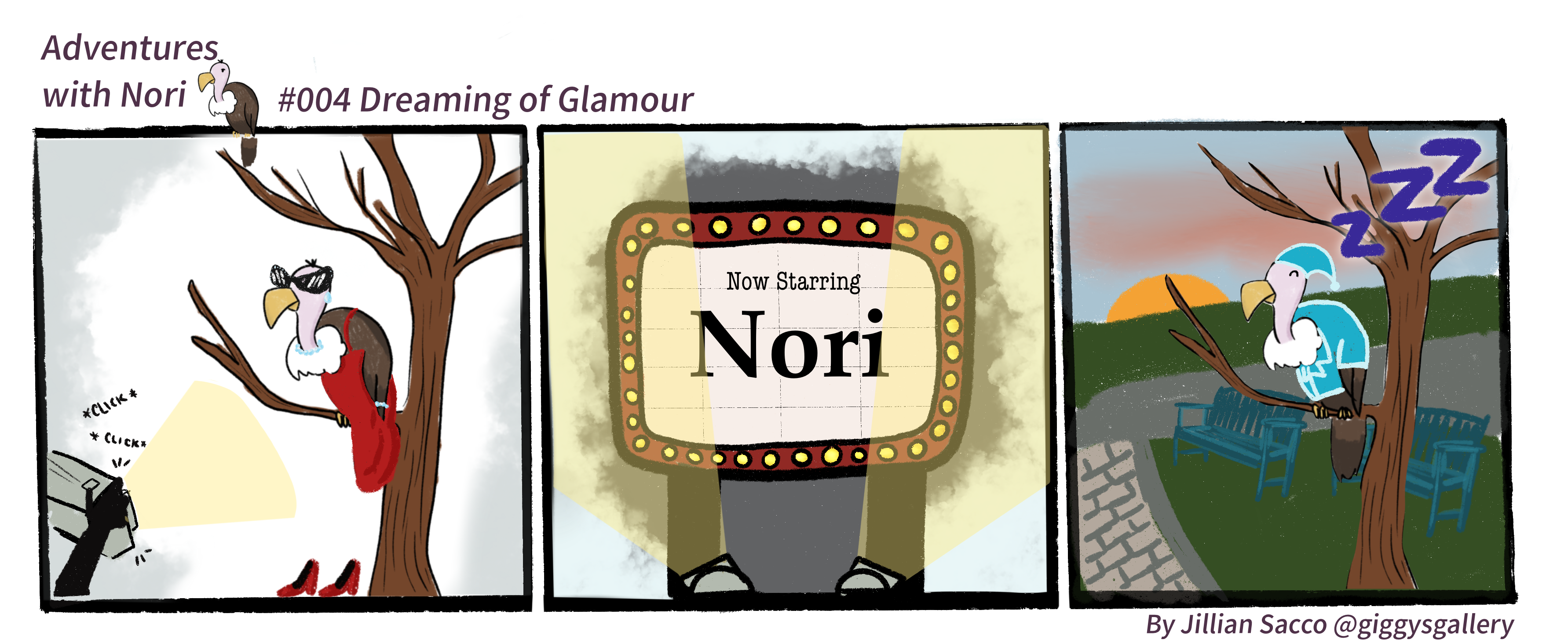 Photo Description: Nori, a vulture, wearing a red ball gown is perched on a tree branch with big black sunglasses. Matching red heals are at the bottom of the tree and someone is taking photos of them. The second panel looks like a dream with fog around the edges with a movie marquee reading “Now Starring…Nori”. The third panel is, without fog, a sunrise over Opportunity Works with Nori snoring away on her branch.