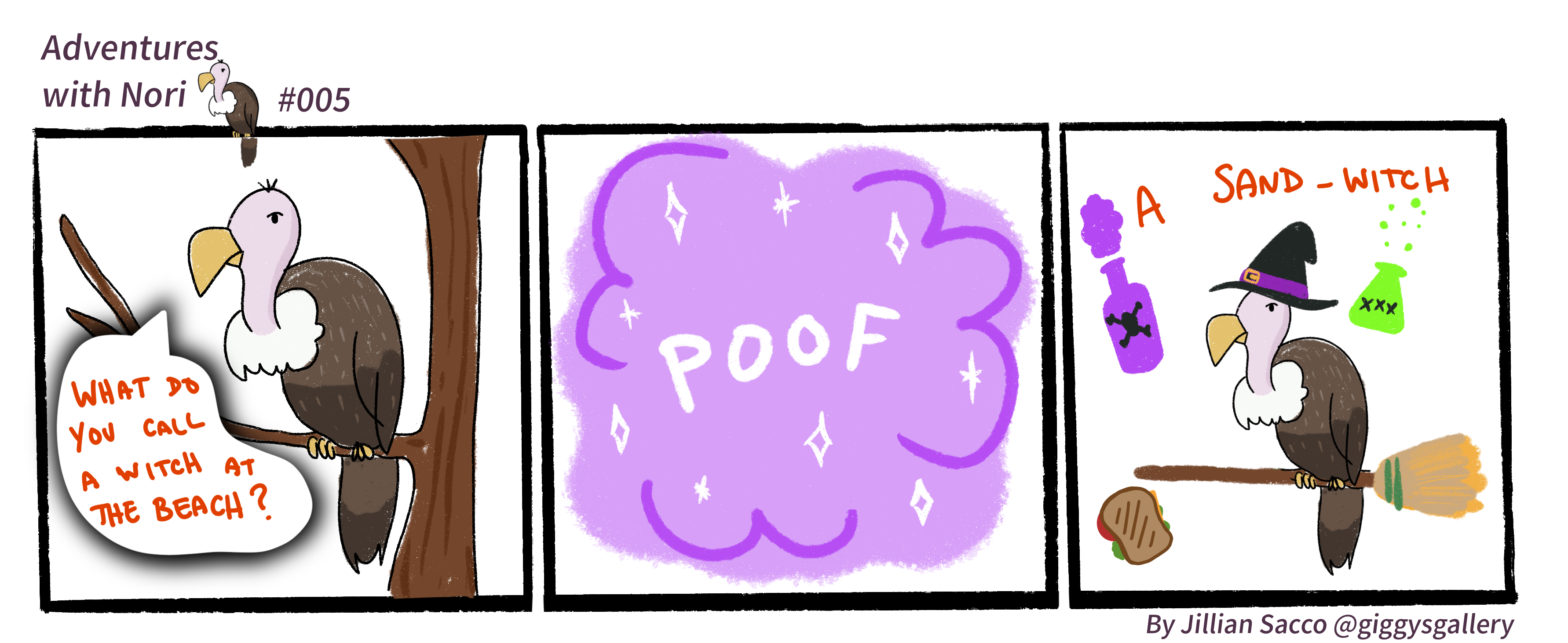Photo Description: Nori, a vulture, asks “what do you call a witch at the beach?”. The second panel reads POOF in a large purple sparkly cloud. The third and final panel pictures Nori riding a broom delivering the answer to the joke- “a sand-witch!!!”