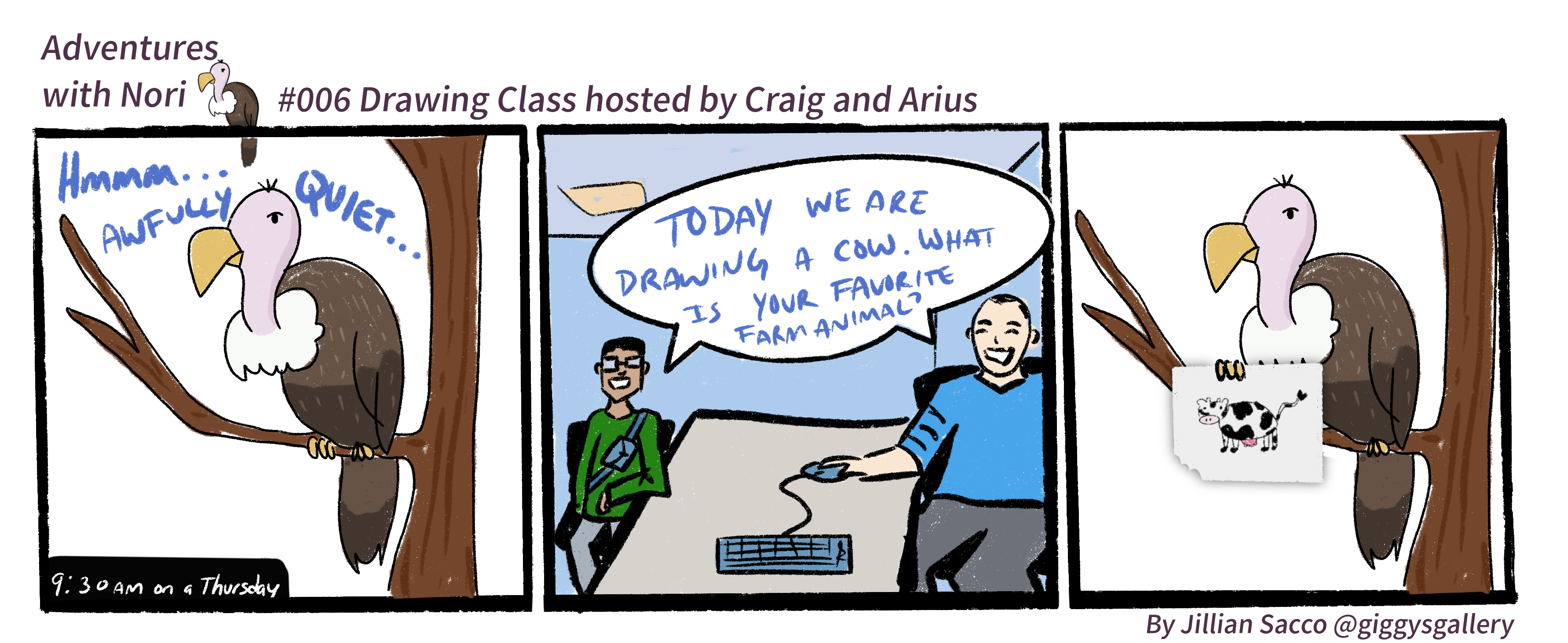 Photo Description: The first panel reads ‘9:30 am on a thursday’ and Nori, a vulture, is sitting on her branch in her usual tree saying “Hmm…awfully quiet.” The second panel you see cartoon versions of Arius and Craig, the hosts of Thursday morning art class, asking their friends on BlueJeans “Today we are drawing a cow. What is your favorite farm animal?” The third and final panel we see Nori was participating in class and made a lovely drawing of a cow and is showing us her work!
