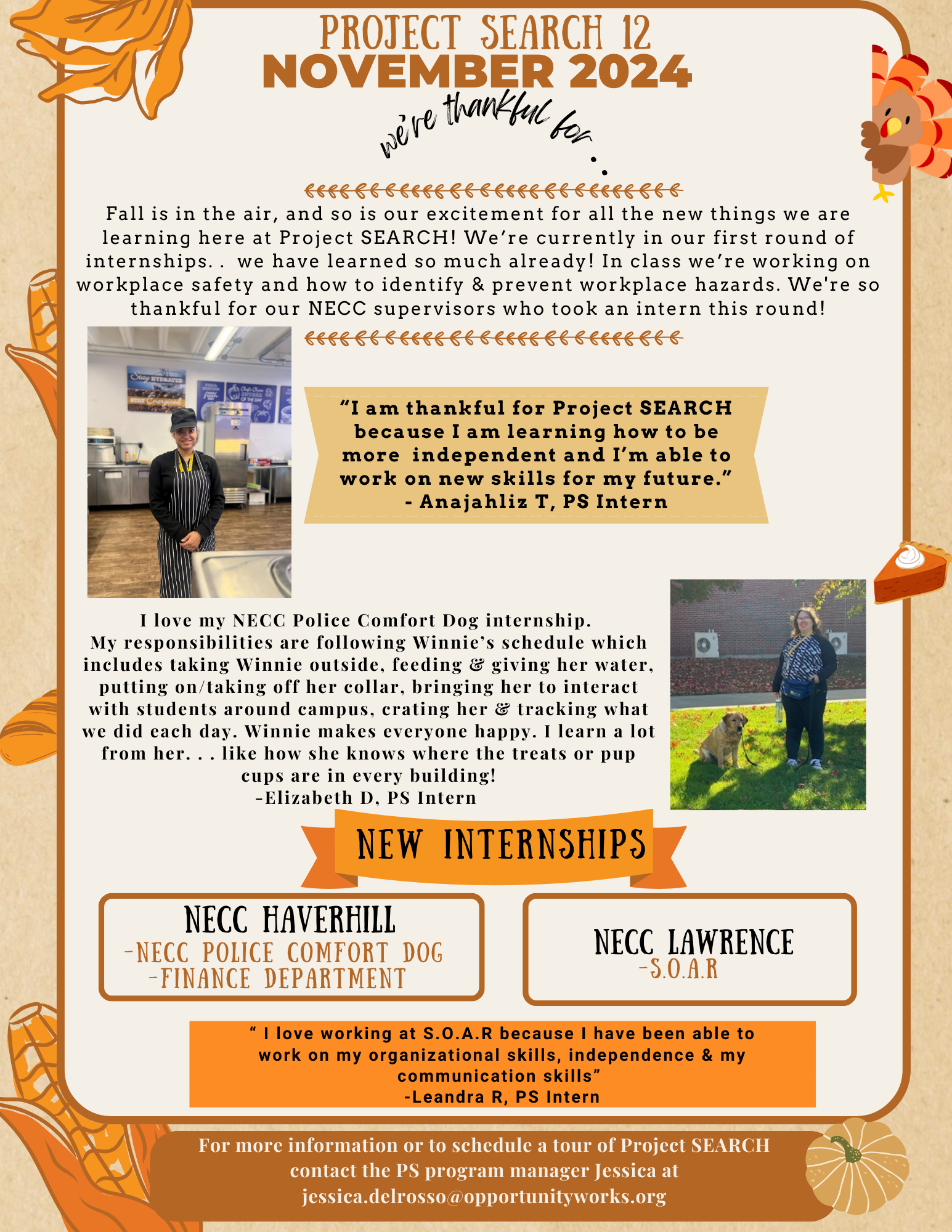 Fall is in the air, and so is our excitement for all the new things we are learning here at Project SEARCH! We’re currently in our first round of internships. . we have learned so much already! In class we’re working on workplace safety and how to identify & prevent workplace hazards. We’re so thankful for our NECC supervisors who took an intern this round!